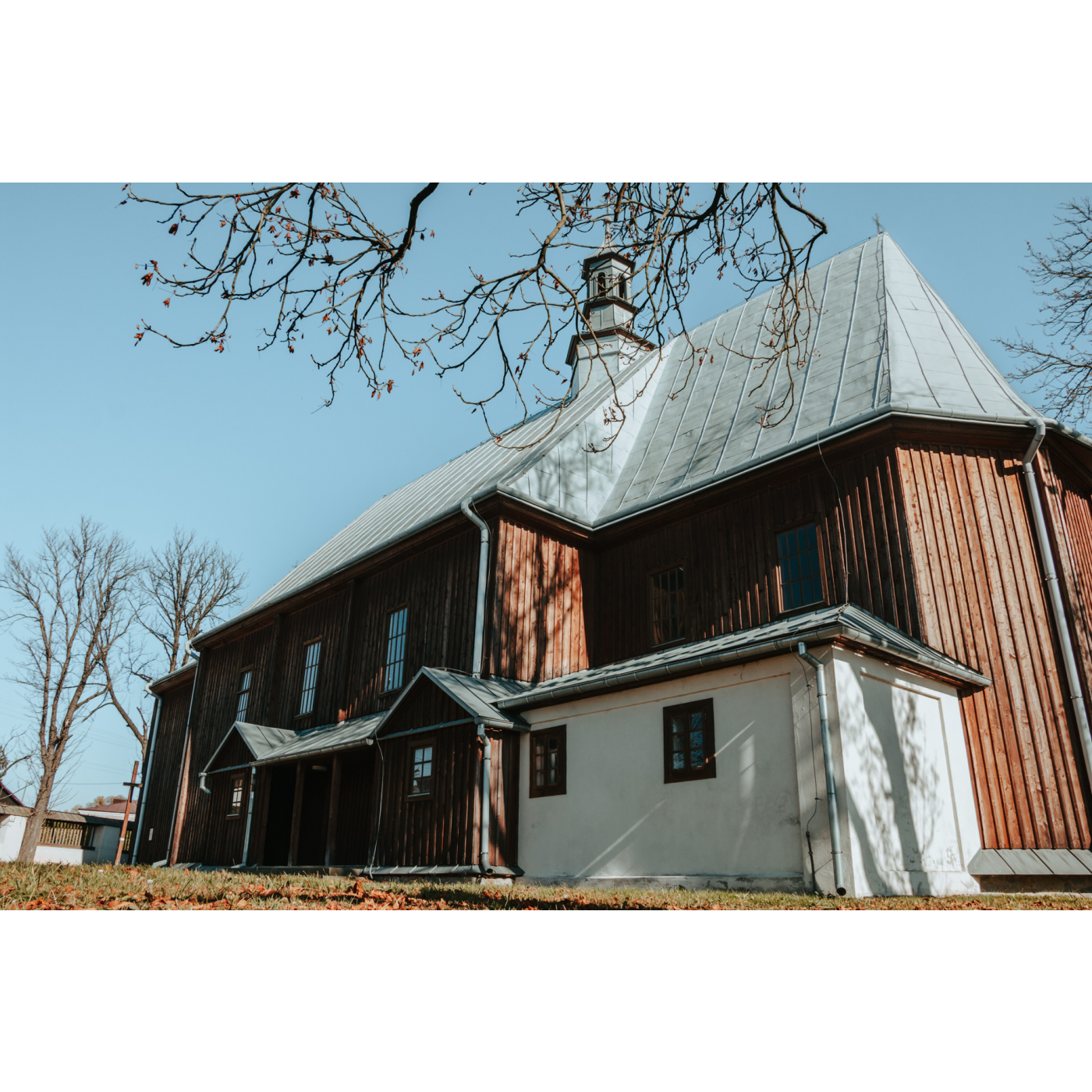 Świątynia, wzniesiona w 1605 roku nie zachowała się w oryginalnej formie, ponieważ przebudowa z końca XVIII wieku dokonała bardzo poważnych ingerencji w strukturze budynku. Pozostał on jednak konstrukcją drewnianą, o wysokim, stromym, dwuspadowym dachu oraz budynkiem trzynawowym z nawami bocznymi oddzielonymi od głównej rządami drewnianych kolumn. Ściany w sporej części ozdobiono polichromiami, w tym podobiznami świętych. Ołtarz główny i ołtarze boczne barokowe, kunsztownie zdobione w drewnie. Na miejsce zlikwidowanej w XVIII wieku dzwonnicy w wieży postawiono dzwonnicę parawanową.